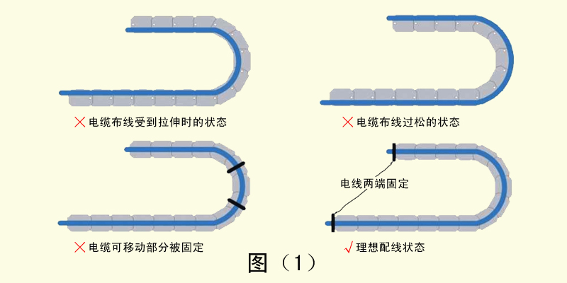 2、如果電纜在布線時愛到張力拉伸,會與拖鏈內(nèi)壁產(chǎn)生摩擦導致護套磨損。反之如果布線過于松散,同樣會與拖鏈的內(nèi)壁產(chǎn)生摩擦造成護套磨損,并且容易與其他電纜產(chǎn)生纏繞現(xiàn)象。電纜的布線長度應設定在剛好能通過拖鏈的中心線宜。電纜的移動部分如果被固定,會導致彎曲應力無法被分散和吸收,會在固定位置造成應力集中。電纜的固定部分應設置在拖鏈的兩端。如圖(1)