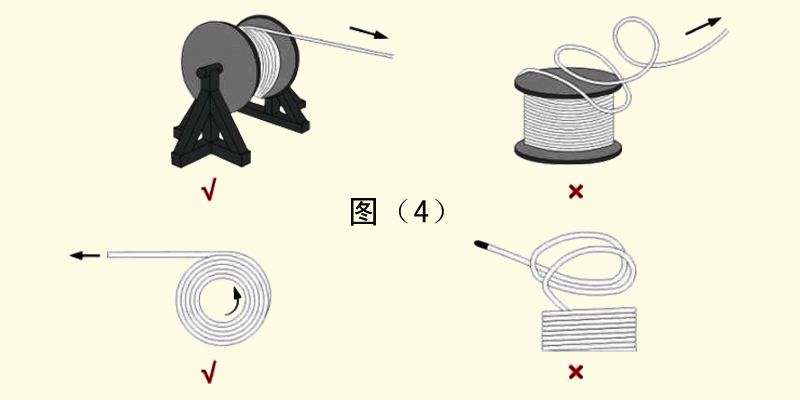 5、拖鏈電纜在敷設中不能扭曲,即不可直接從電纜卷筒或電纜盤上拉出,而應旋轉(zhuǎn)短筒或者電纜盤將電纜展開。如圖(4)